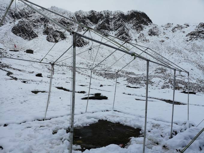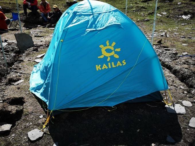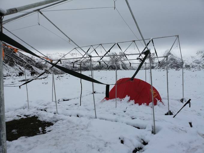 回到大本营营地,仅存的帐篷已被雪覆盖,就是和我们一起登顶的小情侣的帐篷。