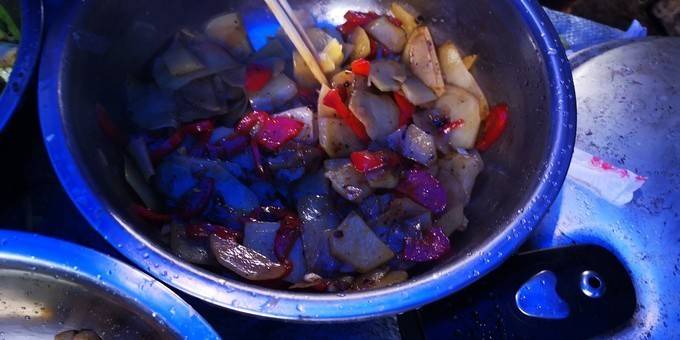 摆桌子,准备营地晚餐了。