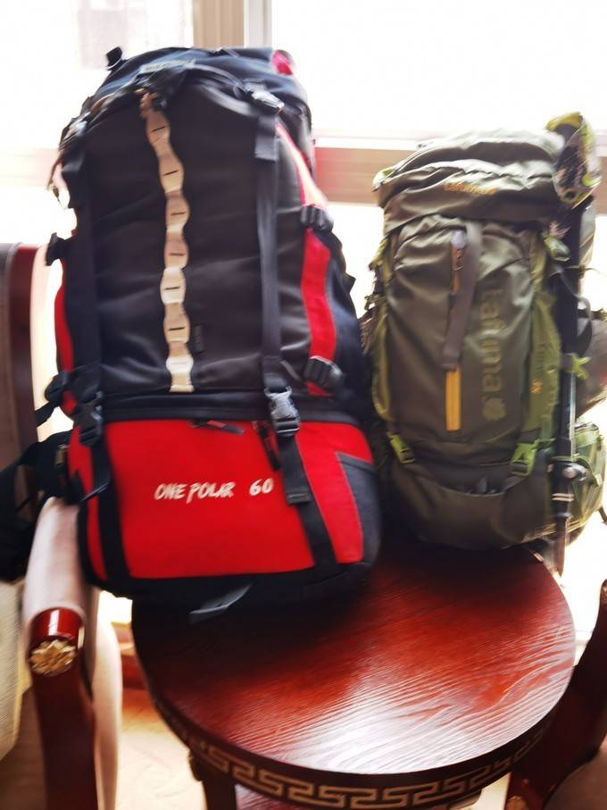 60升重装,交拖拉机/马帮;38升轻装,背了足够的水与路餐,还有雪套、冰爪、手套、御寒衣服等装备,轻装不轻呀。
