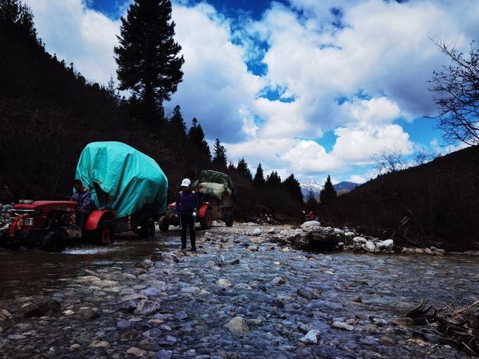 拖拉机来了,为我们运来重装和足迹户外准备的帐篷、食粮、厨具。