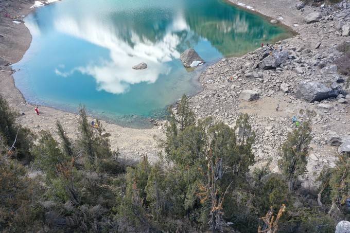 徒步第二天,从 长海 子营地出发,翻越垭口到 长海 子,再翻越4200米雪山,进入阿翁沟,徒步至鱼海子营地。