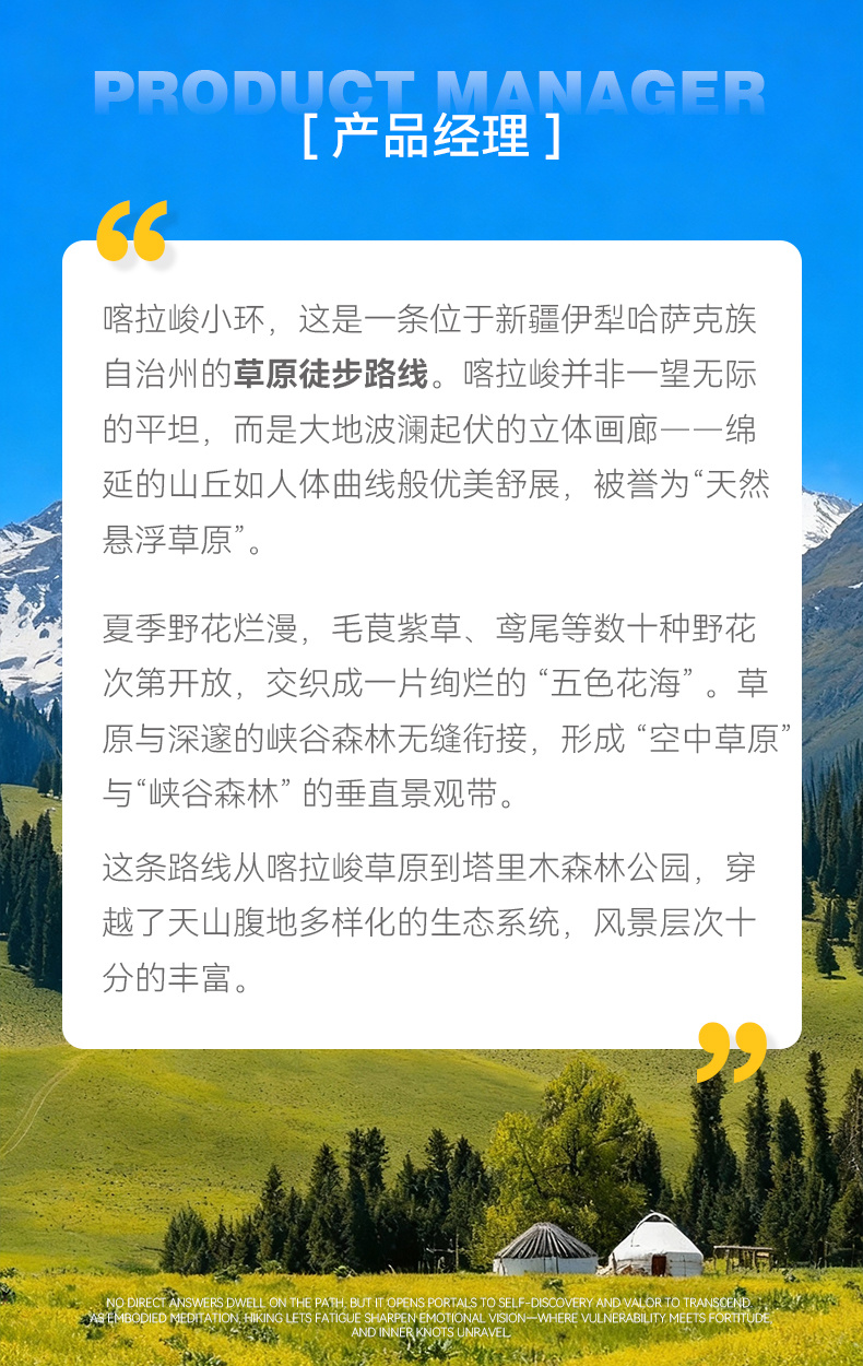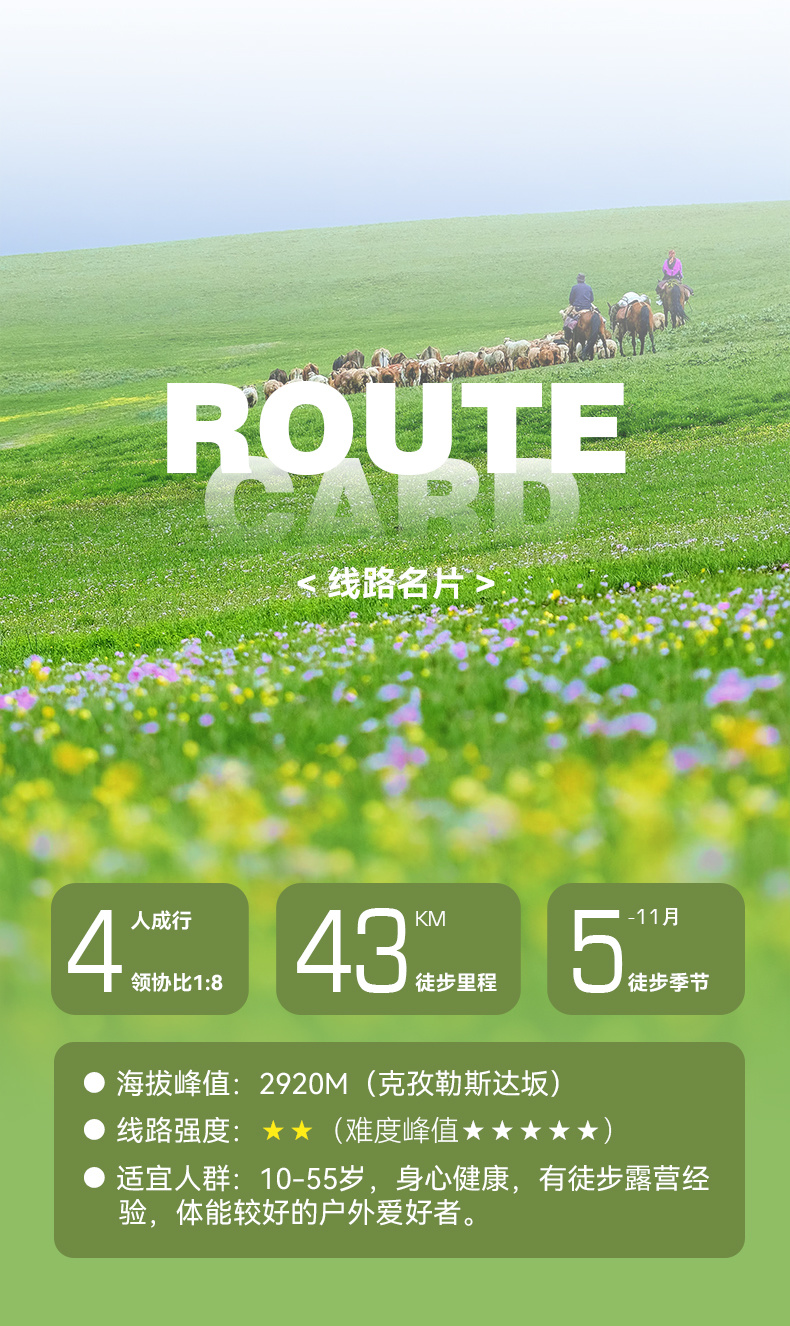 行程概览:在阳光的照射下缓缓拉开帐篷,感受着早间的柔和暖意,微风里夹杂着淡淡花香与鲜草的味道,慢慢收拾起床早餐后拔营出发,今天相比前两天会相对较难,将翻越本次行程最高的点位克孜勒斯达板2920米,站在草原的最高点俯视着莽莽大地感叹着世间的美妙,此刻心中的所有躁意也终将释怀,在这里吃过路餐下午就会迎来一个长的缓下坡,最好抵达我们的塔里木景区。随后乘车返回伊宁散团(21:00左右)本次活动圆满结束!