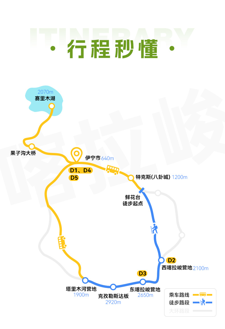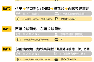 伊宁-(车程约120km,约2h )特克斯-(车程约80km,约2H)鲜花台-(徒步4KM,约2H)-西喀拉峻营地