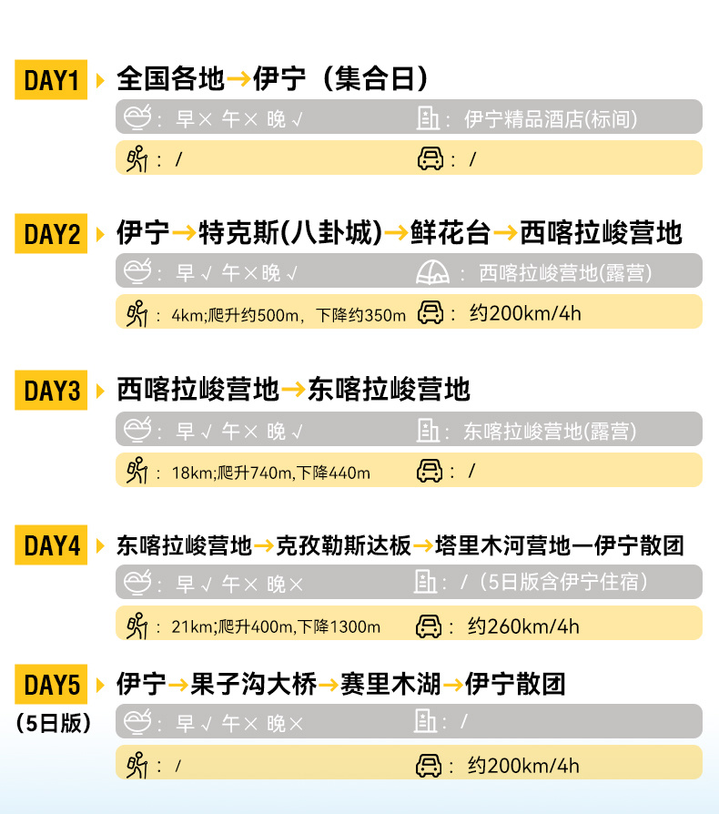 2.在特克斯县城请及时补充物资(干粮等高热量的食物补充体力,全程午餐均为路餐,请依据自身情况合理补充)。