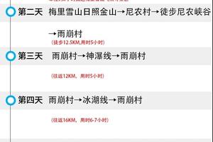 早上 7:30左右起床早餐后与雪山留影之后我们徒步尼龙峡谷走出雨崩村,徒步大概5小时左右→乘车前往经香格里拉(大概 18 点左右)→香格里拉高速路回到丽江解散大概 20:30点左右结束愉快徒步雨崩之旅。