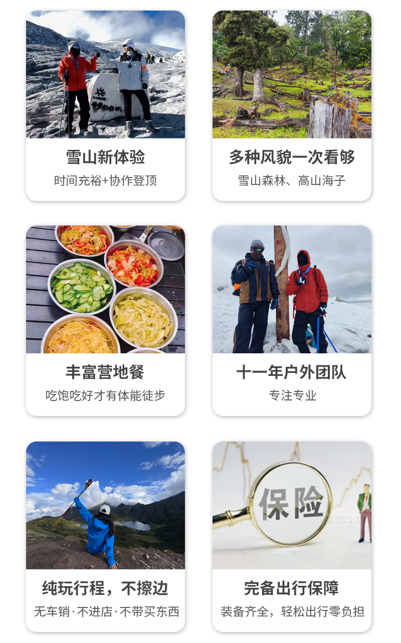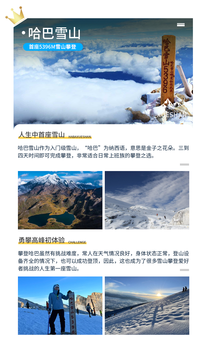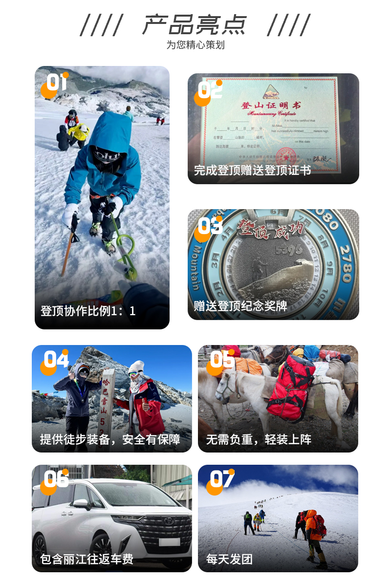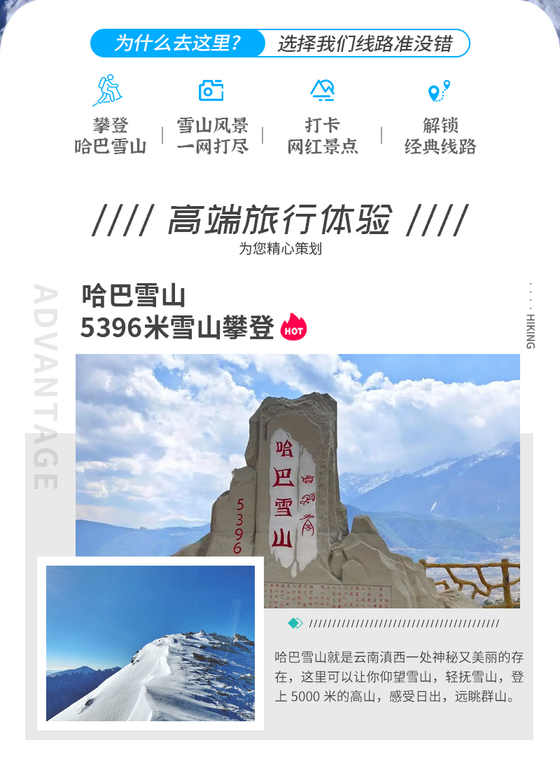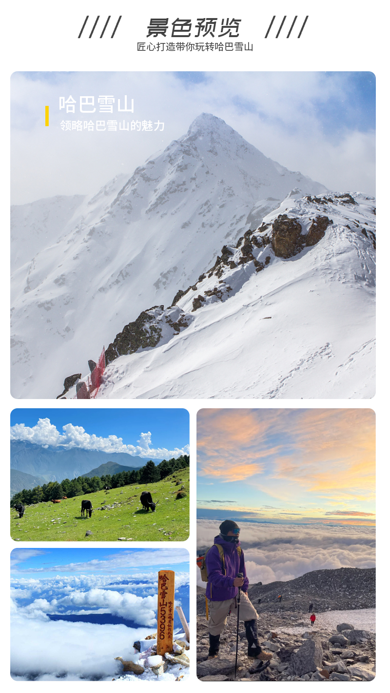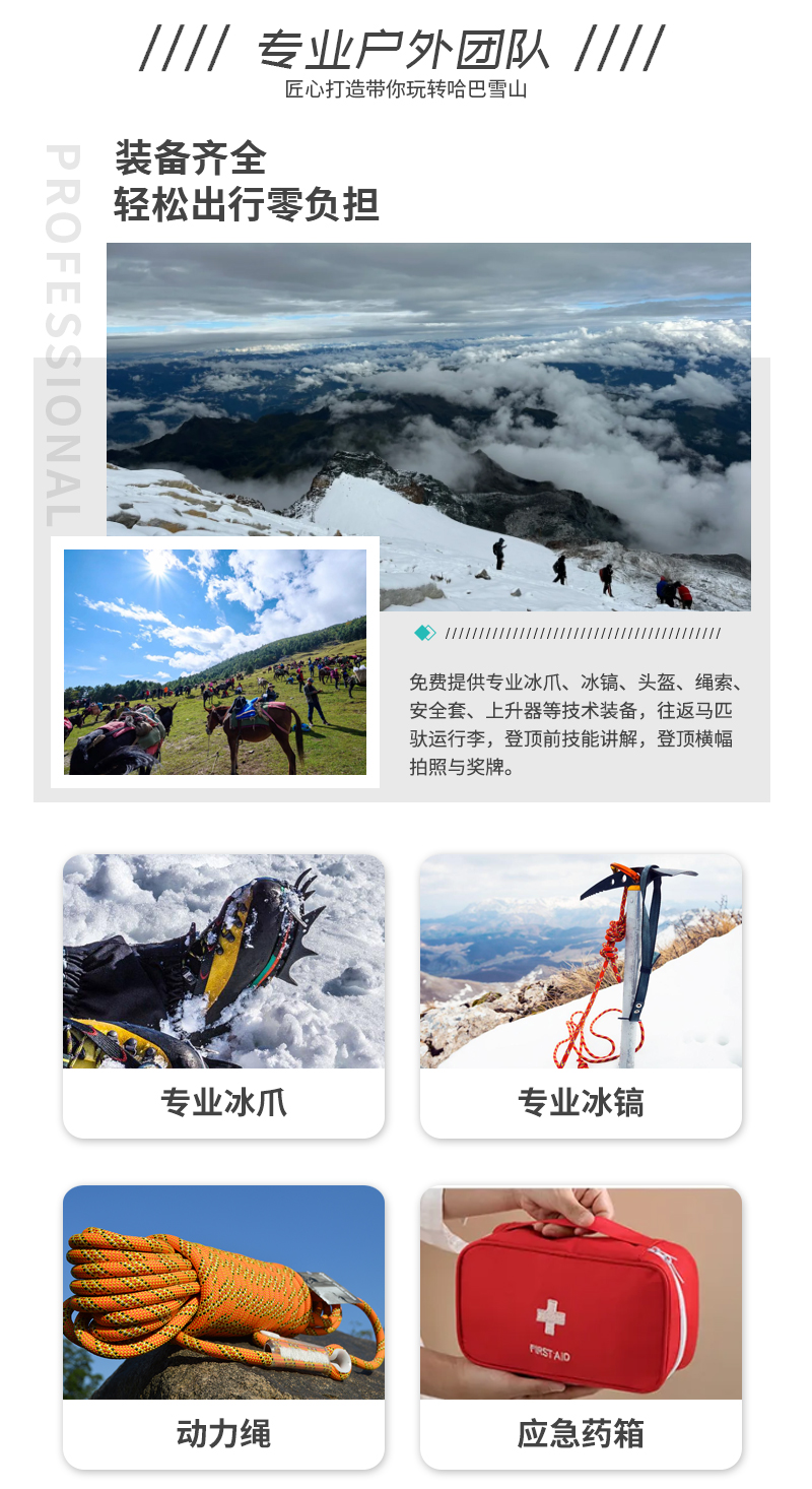 【专业保障】自1996年开始,带领上万登山者登顶哈巴雪山,专业让登山更安全、体验更好。 【登山培训】专业的登山领队进行培训,让登顶更有保障。 【1:1协作】1对1向导的协同作战,让登山事倍功半。 【轻装简行】马帮托运行李,让登山的步伐更加轻快。 【品质体验】专业领队、专业向导。 【后勤保障】提供应急氧气,降低高反风险 【庆功晚宴】精致特色晚宴,共享快乐心情