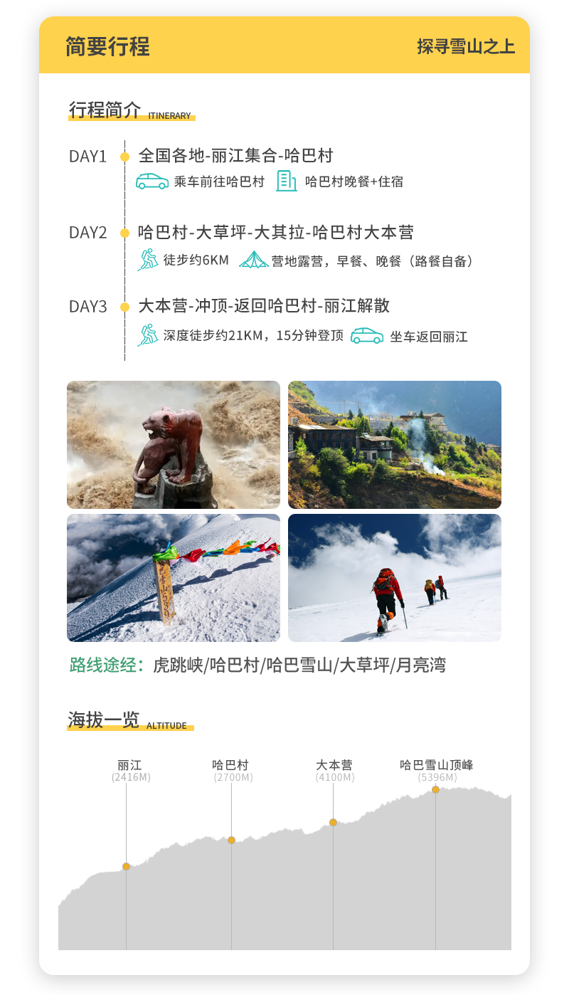 凌晨3点从大本营出发,经过小树林、经过大石板陂,经过雪线,登上绝望坡,走过月亮湾,最终成功登顶哈巴雪山,再原路下撤回到大本营后,返回哈巴村。(注:登顶需天气适合、自身身体适合方可成功登顶。)从大本营下撤至哈巴村,可选择自费骑马。当天登顶成功,可当天发放登顶证书。大约6点左右告别哈巴村,坐车返回丽江,结束行程。(如下撤到哈巴村超过6点,多住一晚,第四天早上返回丽江。)