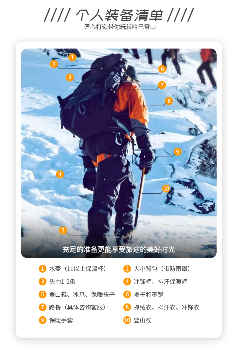 4、技术装备,提供登山杖、冰爪、冰镐、头盔、头灯、雪套等等技术类装备(需交押金)