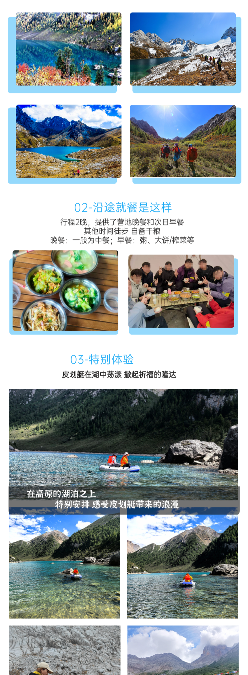 3.餐饮:2早2正餐含营地餐,营地晚餐一般为2荤1素1汤,营地早餐有粥面包或馒头、咸菜。