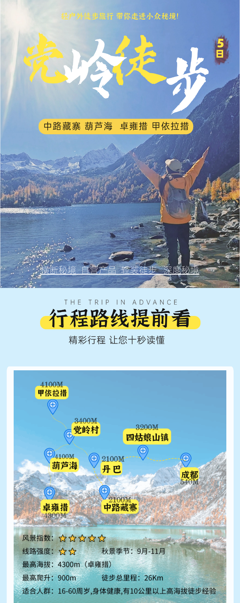 早晨徒步前往观景台欣赏藏寨全景,清晨的藏寨、云雾、光线共同构建了一幅幅水墨之境,之后乘车前往党岭村,安排好住宿后,收拾当天所需的装备开始向卓依拉措进发,从村内乘车约40分钟抵达徒步起点,徒步约2-3小时到达甲依拉措湖旁,此湖一年迎接的客人不足200人,并且湖水常年呈现乳白色,当地又称“牛奶海”。从这里仰望党岭三神山又是另一种风景,下午时分我们开始沿河谷下撤回到公路旁,乘车返回党岭村。