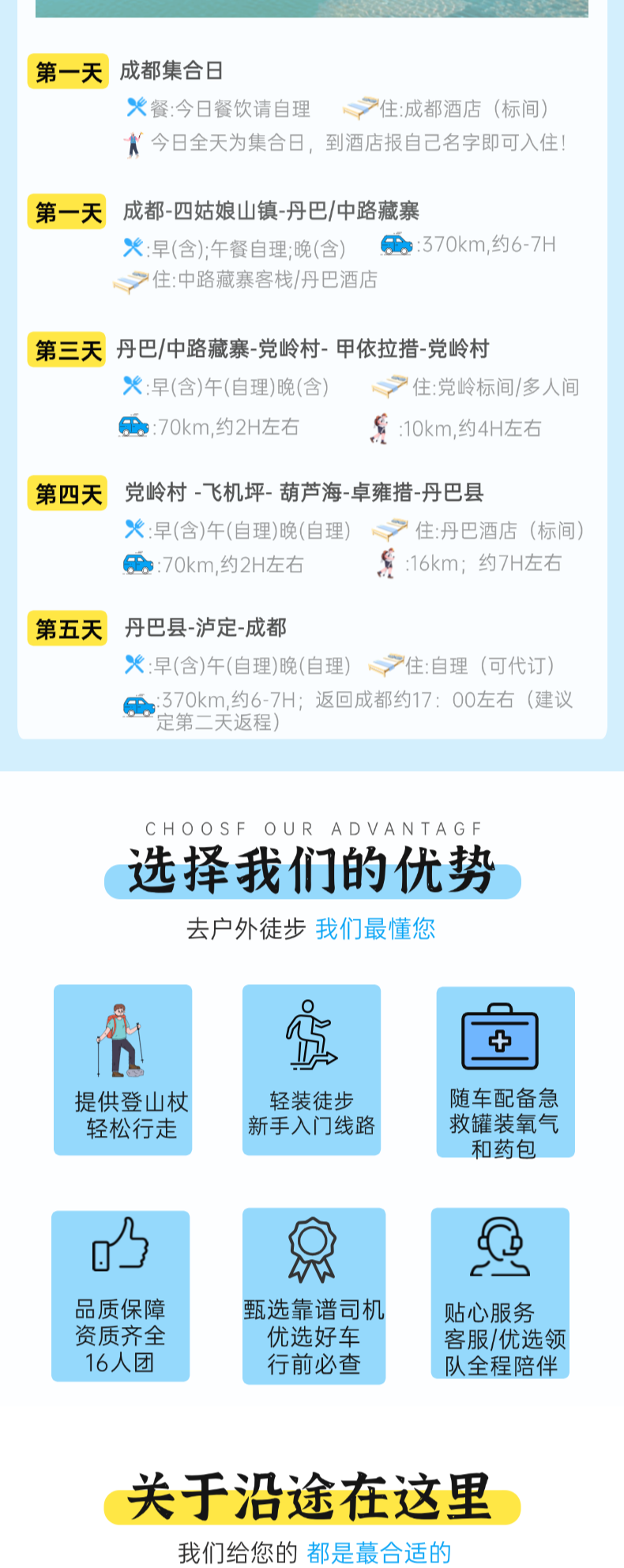 2 、如无法前往丹巴县,交通允许的情况下,改为前往康定勒多曼因徒步 。 (具体情况具体分析,领队可参考队员意愿做出临时调整;若行程变更产生 差价的情况采取多退少补的原则)