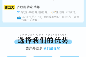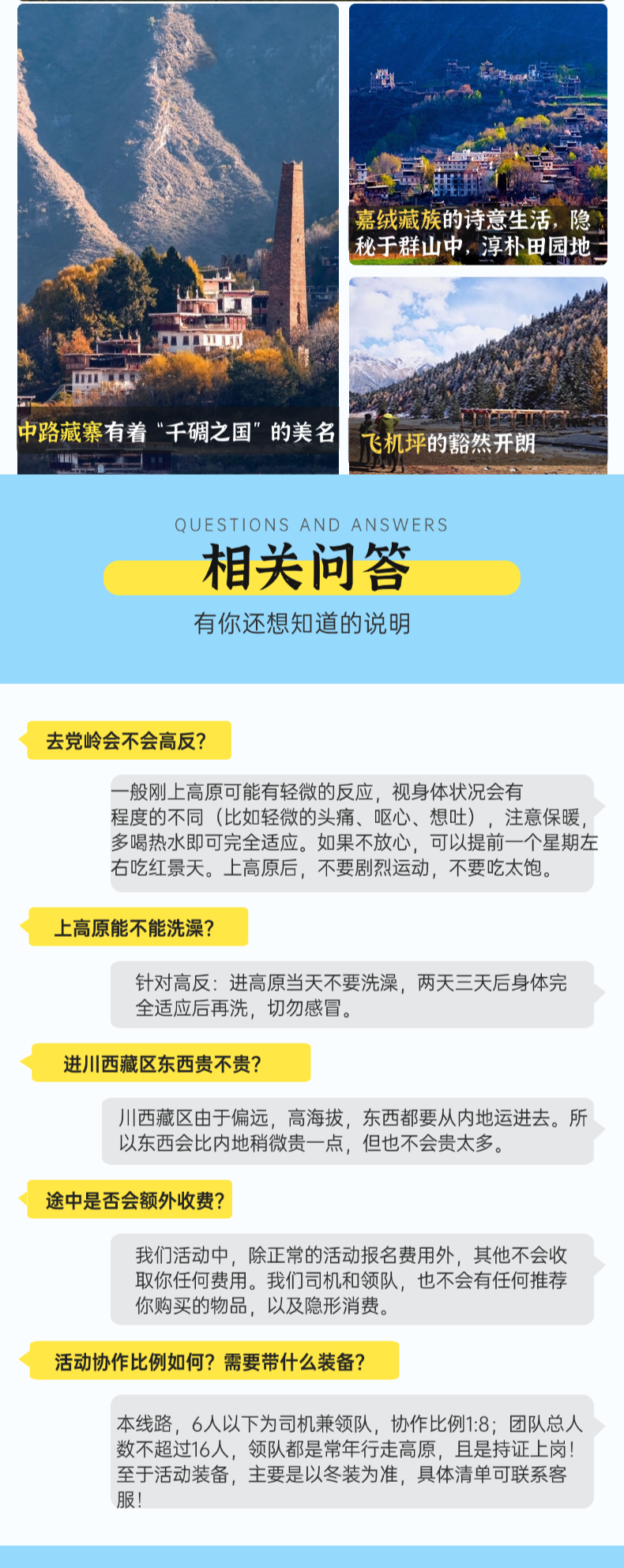 温馨提示:集合日为自由活动,不是正式的行程,请在自由活动时注意人身财产安全,集合日不含保险。房费已付,押金自付。在出发前2天,客服会告知您成都入住酒店信息,集合当日21:00前领队将会与您取得联系,告知次日出发时间等具体出行提示。