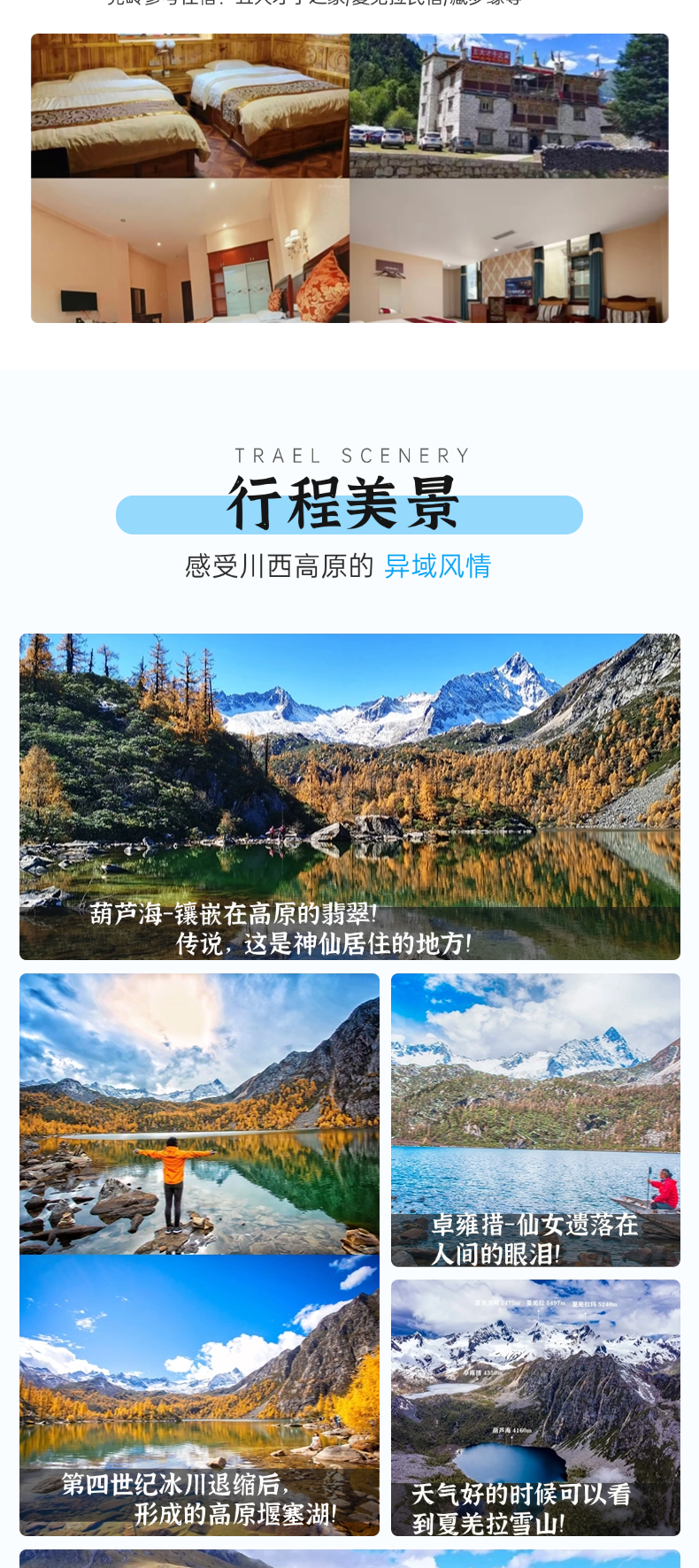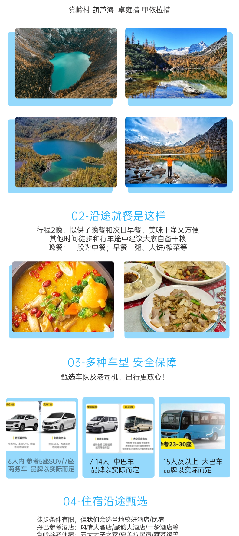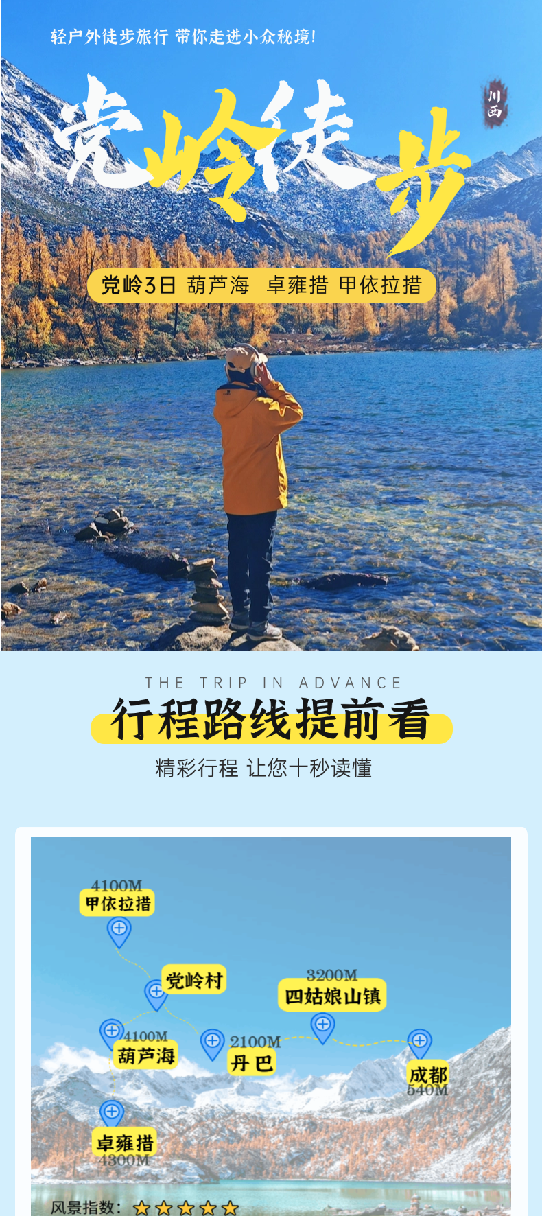 行程概览:若住在丹巴,则整理好装备出发,坐车2小时左右到达党岭,徒步进入横断山脉中最迷人的胜地。沿途欣赏党岭迷人的自然风光。沿着柯鲁河谷上行,来到美丽的葫芦海。葫芦海是状似葫芦的湖泊,由一大一小的两个湖泊组成,继续前景能观赏到小葫芦海,如体力不好的伙伴就可以在葫芦海多游玩一会,体力好的伙伴可以继续前行前往卓雍措往返6公里爬升200米,非常考验个人能力的一段路,爬上卓雍措,则我们就来到了葫芦海的最佳光景台,在冰川的加持下越发神圣,下午时分原路返回党岭村。