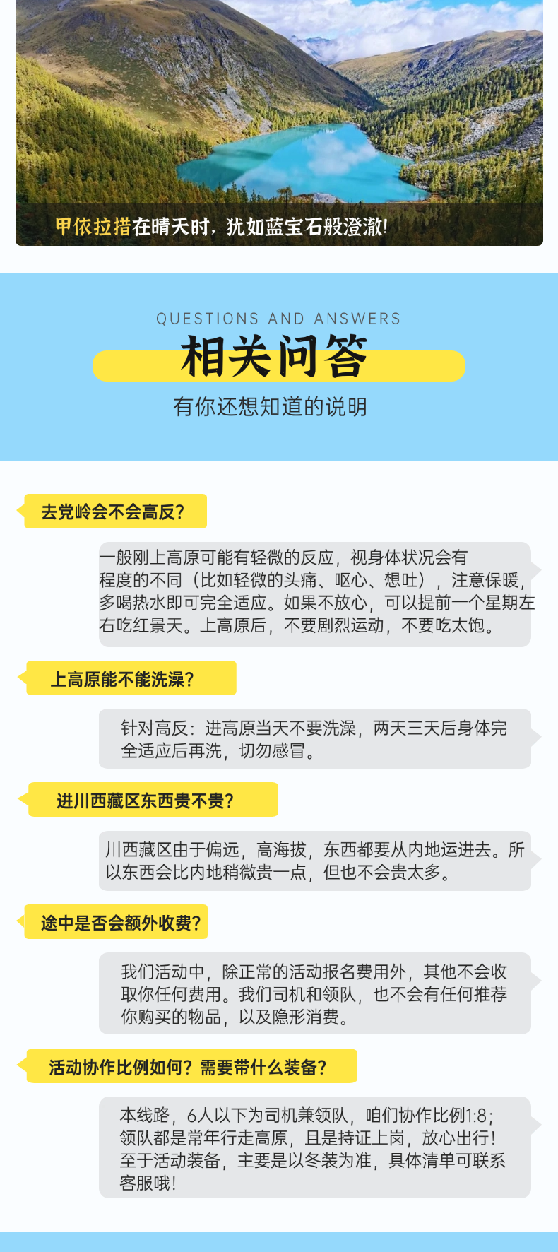行程概览:早餐后告别党岭村,乘车来到徒步起点,开始徒步前往有着小众秘境的代表之一的甲依拉措海子,与葫芦海隔山相望,并且湖水常年呈现乳白色,当地又称“牛奶海”。从这里仰望党岭三神山又是另一种风景,下午时分我们开始沿河谷下撤回到公路旁,乘车返回成都,结束精彩的横断秘地徒步之旅。到达成都的时间大约在晚上22点左右,建议订次日的大交通。
