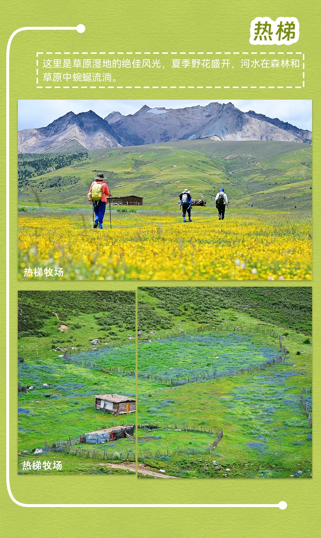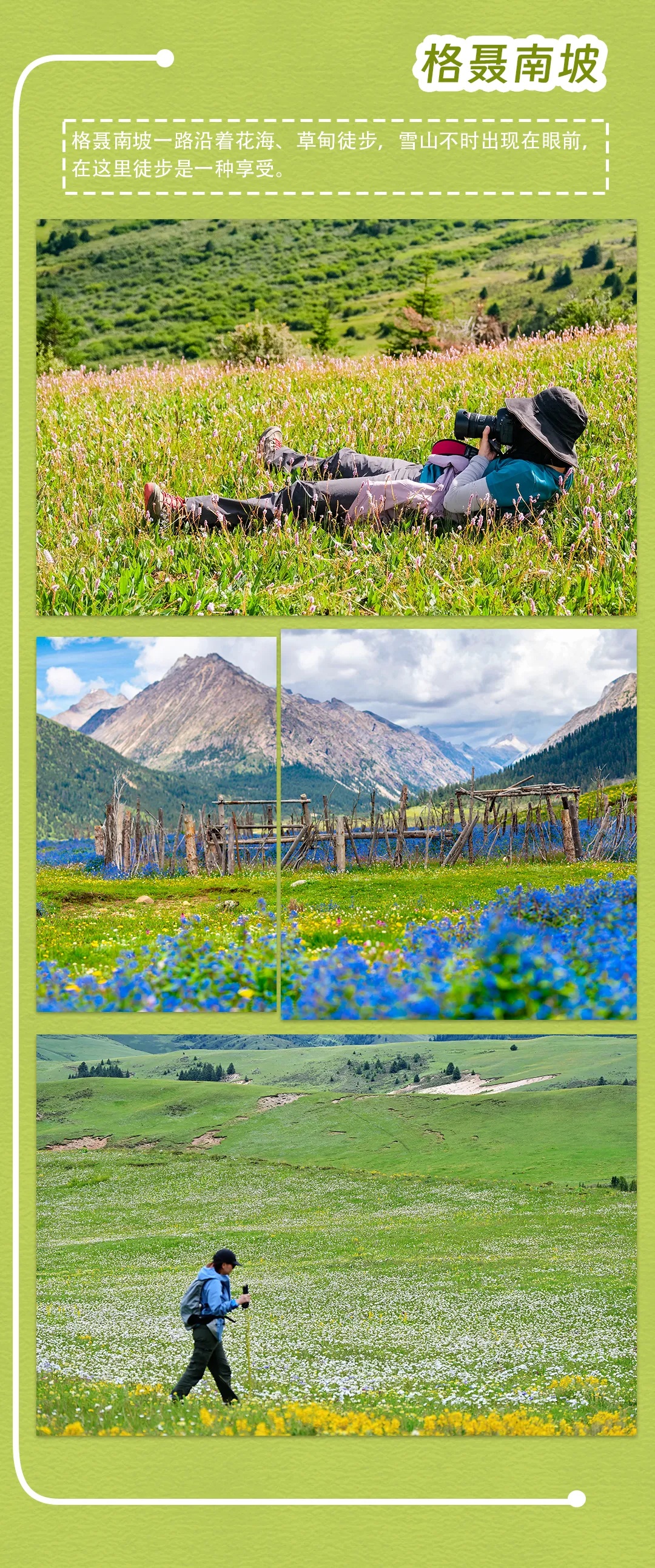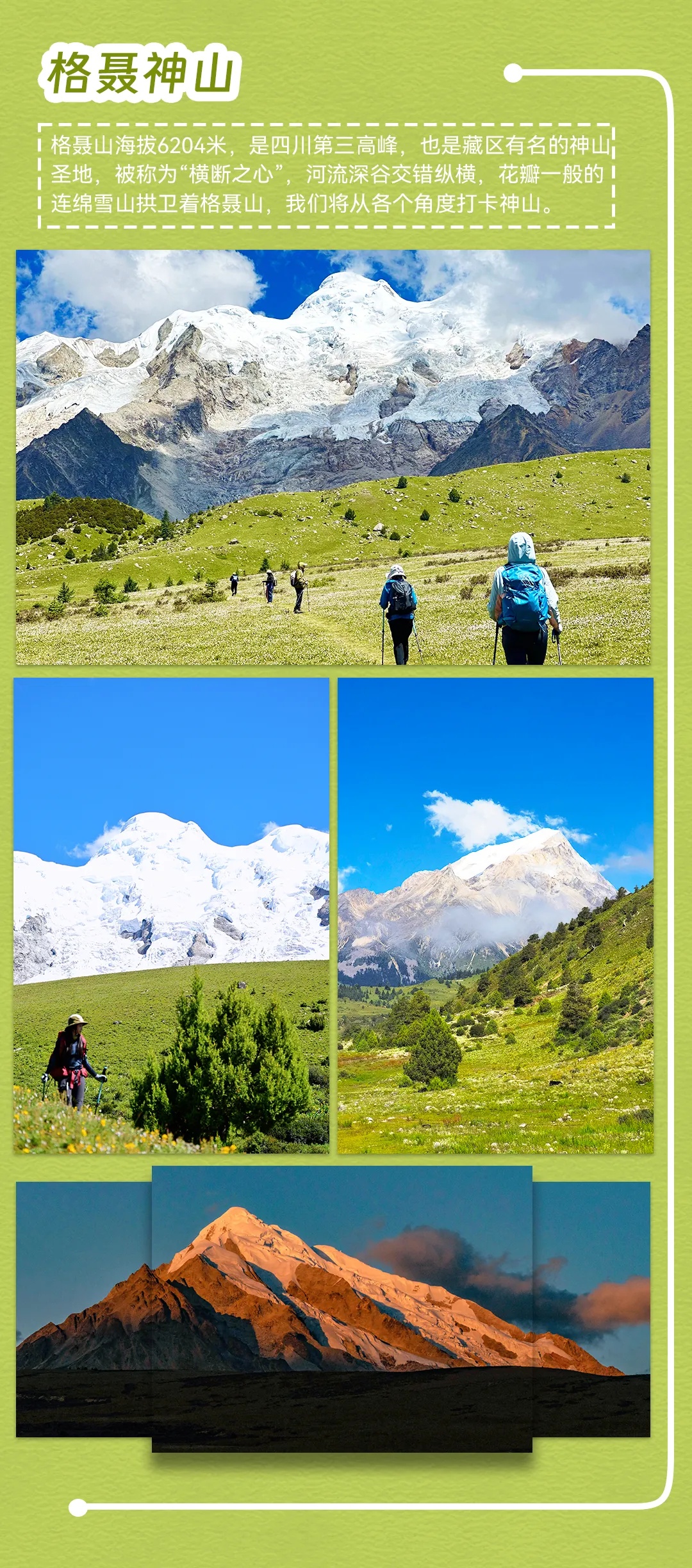 天气好的话,早上我们在营地拉开帐篷就可以看到格聂雪山的日照金山;早餐后我们前往格聂南坡徒步徒步起点,开始我们今天徒步之旅;开始徒步之后我们先是穿越一段原始森林,之后迎着格聂雪山,穿行在满是花海的草原上,格聂雪山南坡是冰川发育最为完整的一段,抬头就可以看见巨大的冰川;在我们穿过岛岛河谷之后,便从格聂南坡走到格聂西坡;这里有一个非常宽阔的峡谷叫热梯河谷,在森林和草原中间,一条弯弯曲曲的河流非常壮观;我们到达热梯河谷之后,结束我们此次的徒步行程,乘车返回理塘,晚上可以在理塘县城品尝一下高原牦牛汤锅;