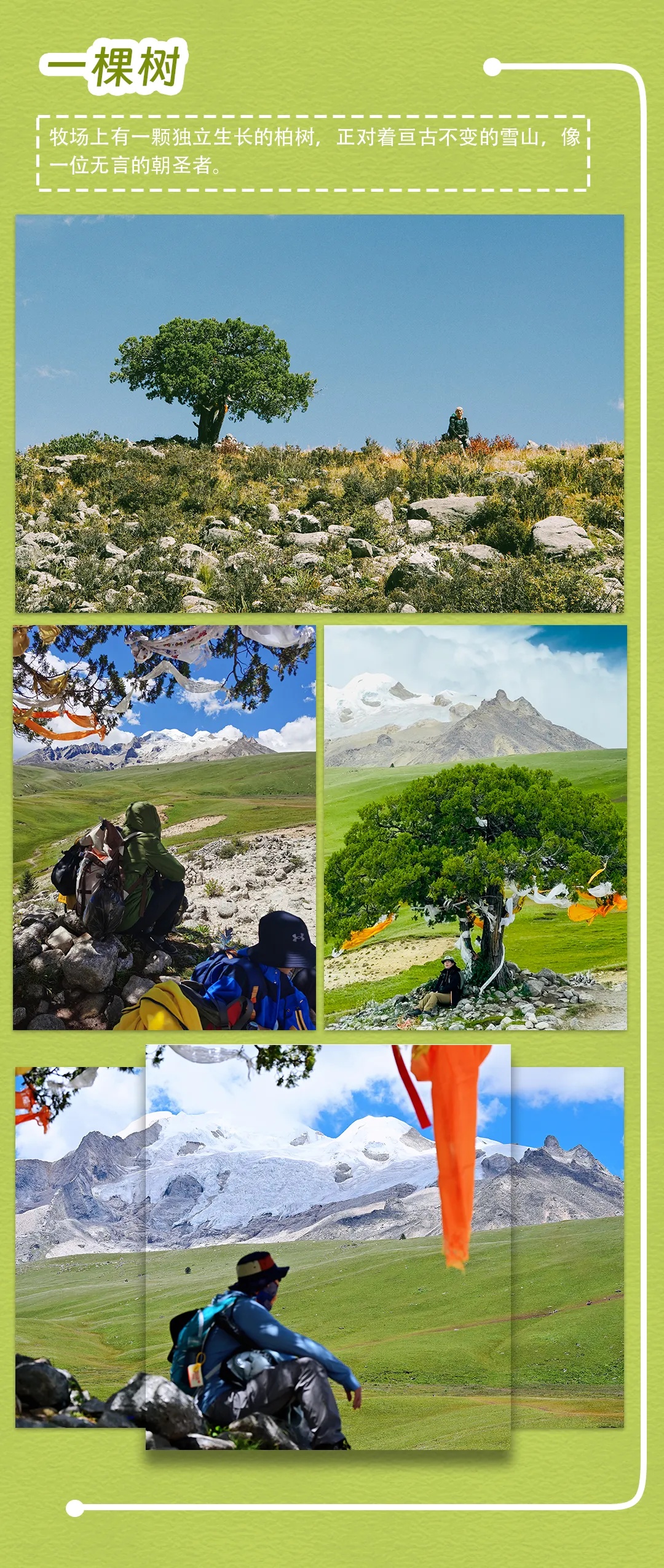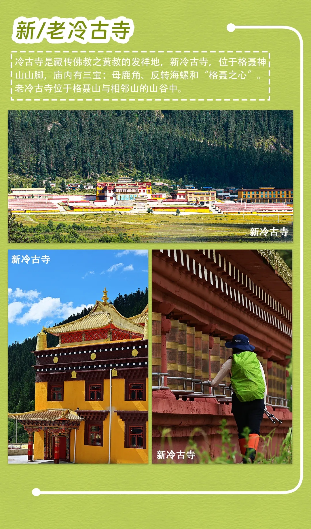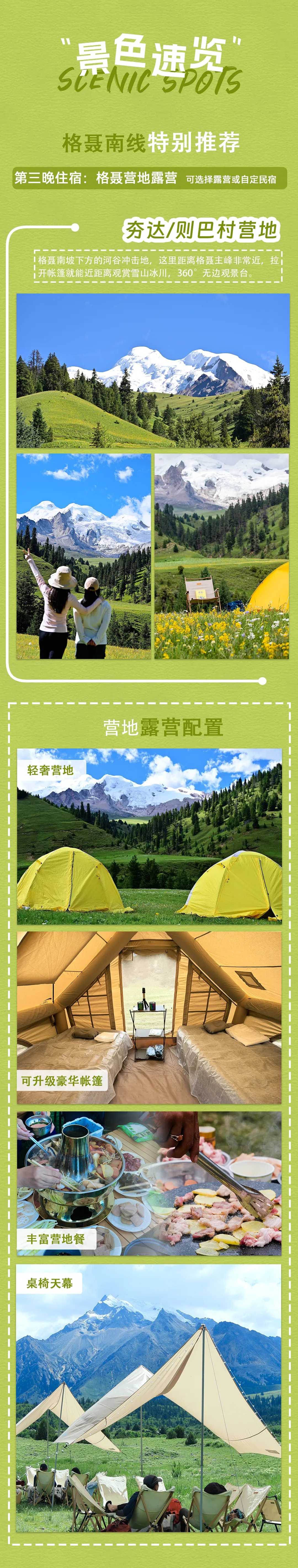 早餐后便前往座落在格聂雪山下的冷古寺,我们先是到达新冷古寺,新冷古寺背依格聂雪山,面向虎皮坝,每每日出的时候都非常壮观;这里还存放着珍贵的格聂格聂三宝(格聂之心、母鹿角、反转海螺)以及格萨尔王的头盔;参观完新冷古寺之后,我们收拾行装,开始徒步前往格聂雪山下最坚毅的“一棵树”,需要从海拔3800米爬升至海拔4500米,一棵树“在雪山下的草地上形成了一道靓丽的风景线,无论背景是雪山还是草地,都非常美丽;这里不仅能够看到唯美的一棵树,还能近距离观赏格聂主峰那万年不融的冰川;这一段徒步的花海也是格聂最美花海之一;(若你不想走路,也可以乘车前往则巴村骑马点,骑马前往一棵树)之后我们徒步前往则巴村营地,体验火锅和烤肉,晚上我们就在这里露营;掀开帐篷就能够看到格聂最美的南坡冰川;如果不想露营的可以前往则巴村住宿(自理)。