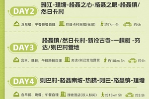 早起乘车前往成都;走国道318,再次经过卡子拉山、剪子弯山、高尔寺及折多山哑口。在到达情歌故乡康定之后上高速,在傍晚时分到达成都结束愉快的旅程。到达成都的时间大约在晚上19点左右,由于川西道路路况比较复杂,堵车随时可见,所见建议大家尽量第二天的飞机离开;今天主要以赶车为主,车程较长,大家也可选择在稻城亚丁机场乘坐飞机前往成都。