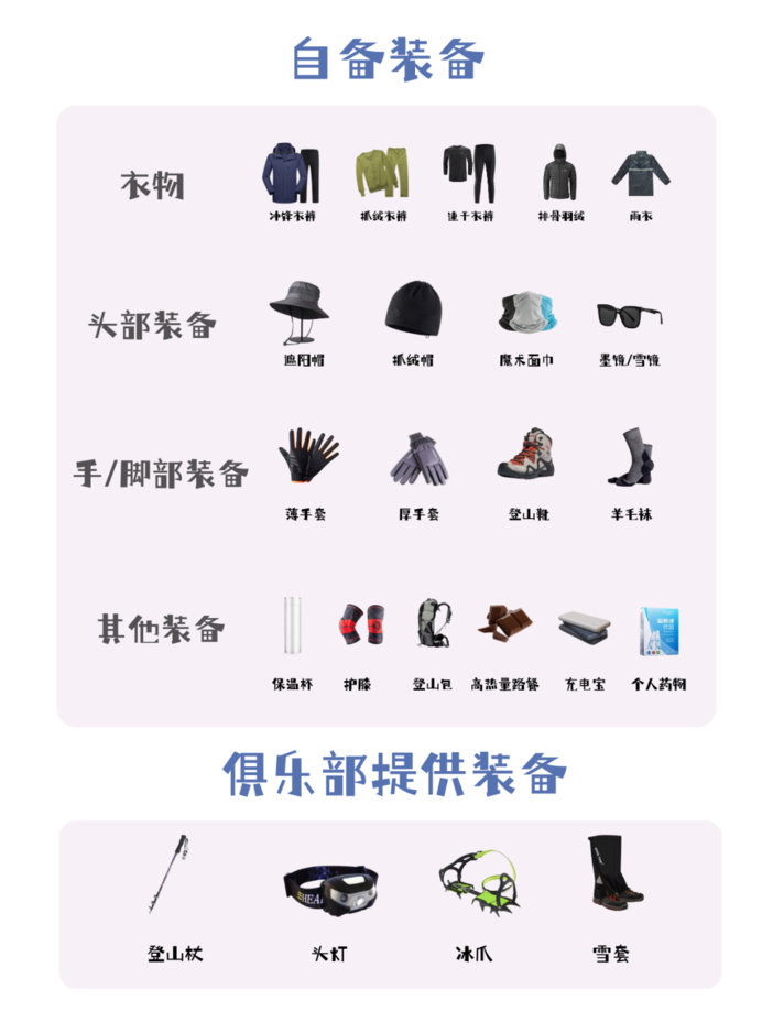 我们提供:头灯(自备 节 号电池)、冰爪、雪套、登山杖、睡袋、登山技术装备